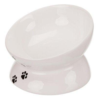 De Trixie Voerbak Kat Wit 150 ml 13 cm is een ergonomische, keramische voerbak of waterbak voor de kat. Deze bak staat verhoog, op een soort voetstuk, waardoor de kat minder ver door de poten hoeft te zakken om te eten. Dit komt de gewrichten en spijsvertering ten goede. De bak is gemaakt van keramiek en daardoor niet alleen makkelijk af te nemen, maar ook te gebruiken voor water of natvoer. De voerbak is wit met een leuke opdruk van zwarte pootafdrukjes.