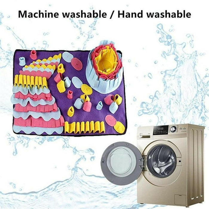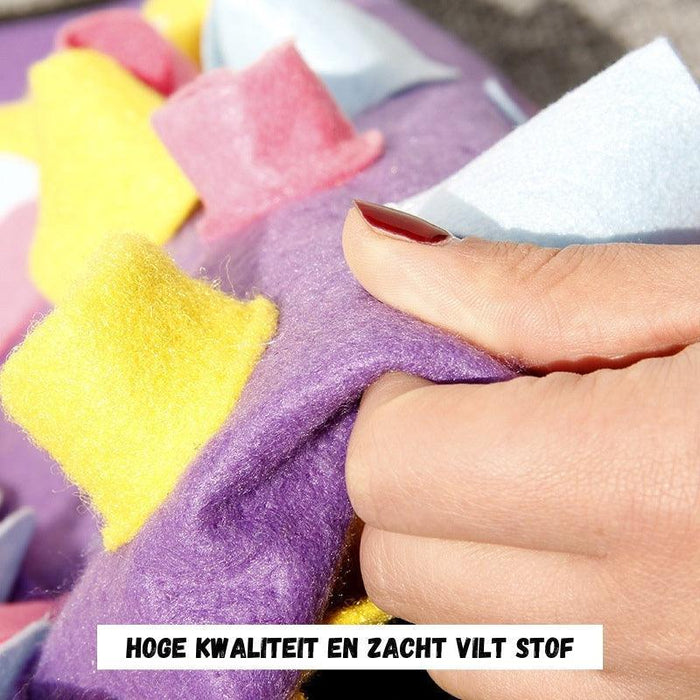 De mat heeft een antislip onderkant zodat de mat altijd op zijn plek blijft liggen en niet wegschuift tijdens de zoektocht naar eten. De bovenkant is gemaakt van een zacht fleece stof zodat jouw vriendje in alle veiligheid kan zoeken. De snuffelmat is dus een zachte en veilige plek voor uw hond of kat om te snuffelen en eten!