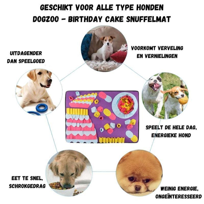 Schrokt je hond ook zijn eten op zonder te kauwen of ben je gewoon opzoek naar een leuke uitdaging voor je hond of kat? Bestel dan deze XXL snuffelmat Birthday Cake van Dogzoo, deze snuffelmat heeft alles wat je zoekt!