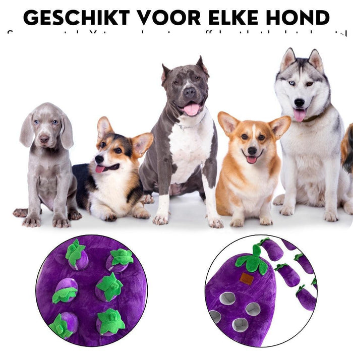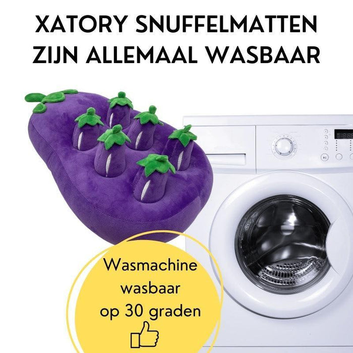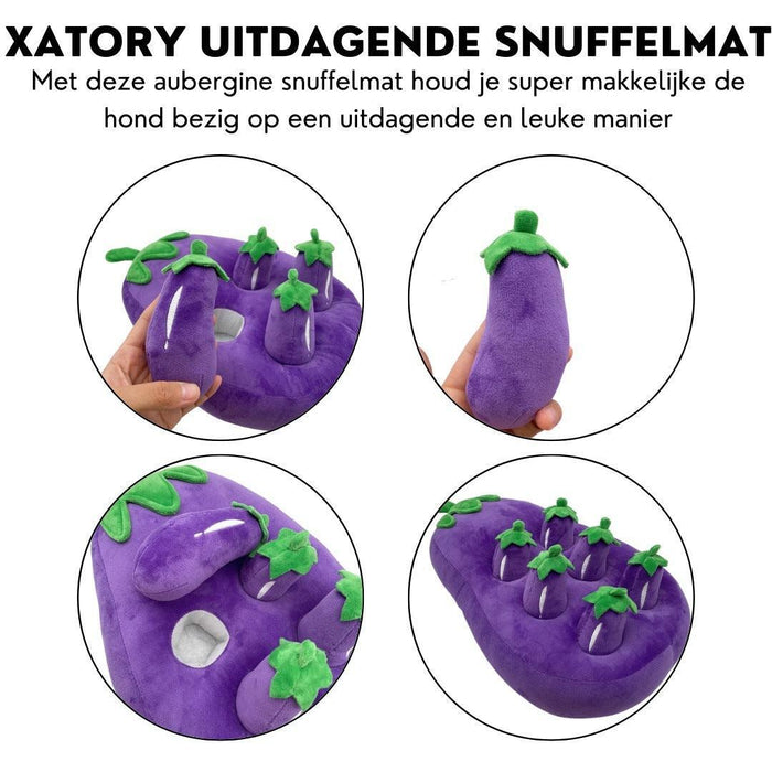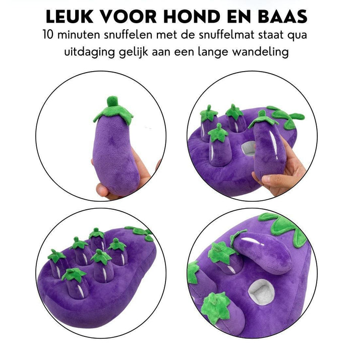 De Aubergine Snuffelmat is voorzien van schattige baby aubergines, waardoor het speelplezier naar een hoger niveau wordt getild!