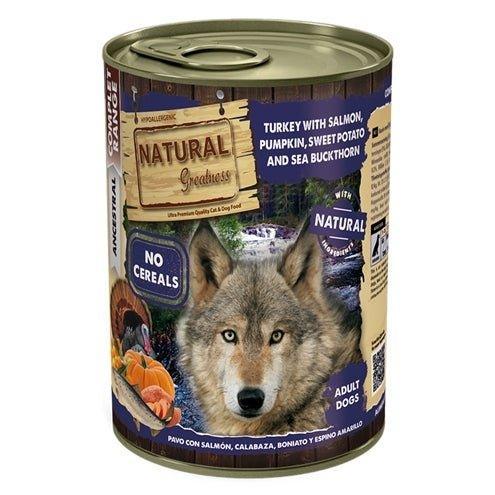 Natural Greatness Turkey/Salmon/Pumpkin/Sweet Potato 400 gr This delicious recipe with turkey, salmon, pumpkin and sweet potato contains two sourc...