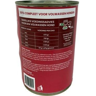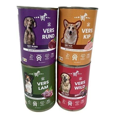 The Fred Canned Fresh Game 12X400 gr is a complete dog food for adult dogs with game and a high moisture content. With this tasty food from Fred you can offer your dog a delicious meal. This canned food is a complete meal, but can also be mixed with the chunks for an extra taste sensation! It contributes to optimal intestinal flora and supports health.