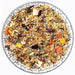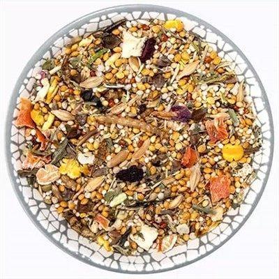 Composition: Plata millet, pea flakes, quinoa seeds, puffed amaranth, mung beans (5%), white millet, oat kernels, spelled flakes, red millet, sweet lupine flakes (3%), kamut, buckwheat, barley, linseed (2.5%), sesame, carrots, perilla seed (2%), grass seed, parsnip, milk thistle seed, mealworm (1.5%), dandelion leaf, alfalfa, yarrow, plantain, beetroot, calcium carbonate, chamomile blossom, marigold blossom, rose blossom, semolina bran (millet 30.5%)