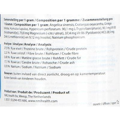 Samenstelling: per 1 gram, Dong Quai, Hop (Humulus lupulus), Japanse notenboom (Ginkgo biloba), Meidoorn (Crataegus oxyacantha), Sint-Janskruid (Hypericum perforatum), 90,1 mg L-Tryptofaan, 90,1 mg Vitamine B3 (nicotinamide), 73,0 mg Magnesium (als -citraat), 37,4 mg Vitamine B6 (als pyridoxine HCl) 28,5 mg Zink (als -L-methionine) en 9,12 mg Inositol. Een verdunning van Natrium phosphoricum.
